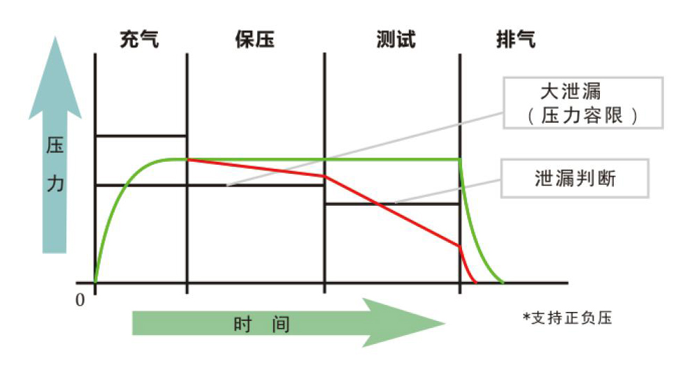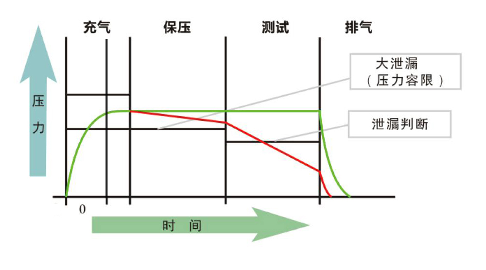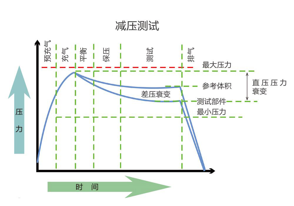 差壓壓力衰變測(cè)試采用直壓相同的壓力設(shè)置參數(shù),通過(guò)差壓傳感器測(cè)量參考體積空氣壓力和測(cè)試部件體積之間的壓力變化來(lái)判定泄漏率。在差壓衰變測(cè)試中,測(cè)試出的泄漏值為參考體積和部件體積之間的壓力損失率,它快速、可靠、靈敏,足以檢測(cè)出微小的泄漏值。