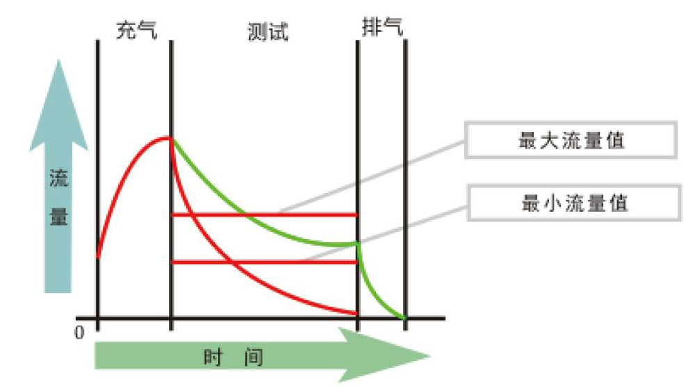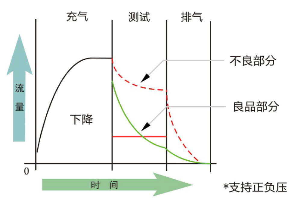 正負(fù)流量測(cè)試是通過(guò)測(cè)量部件的氣體流量值,來(lái)確保氣流路徑上沒(méi)有阻塞物,也可以用于氣密檢漏測(cè)試。在充氣后保持段平穩(wěn),在測(cè)試階段,如在最大和最小流量值范圍內(nèi)則為良品,反之則為不良品。正負(fù)流量的充氣過(guò)程是由一個(gè)旁路產(chǎn)生測(cè)試部件需要的測(cè)試氣壓,也可以設(shè)置為不需要充氣過(guò)程,這樣使得測(cè)試部件直接通過(guò)測(cè)試回路充氣。